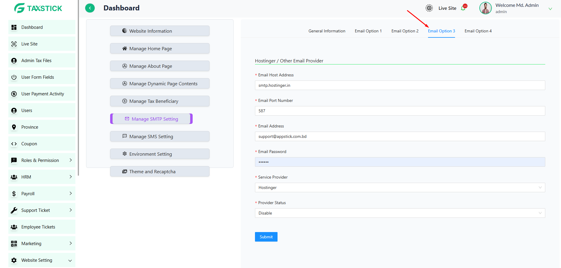 Email Option 3: This option is enabled by default. If you are using Hostinger as your email provider, you can obtain the required SMTP credentials from the Email Settings section of your Hostinger account (or via Gmail if the domain email is connected to Gmail).