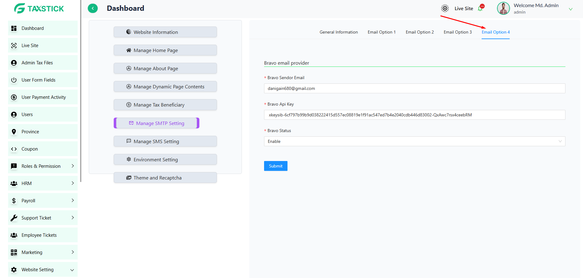 Email Option 4: Use this option if you are using Bravo as your email provider. Enter the sender email and API key from your Bravo account to activate the service.